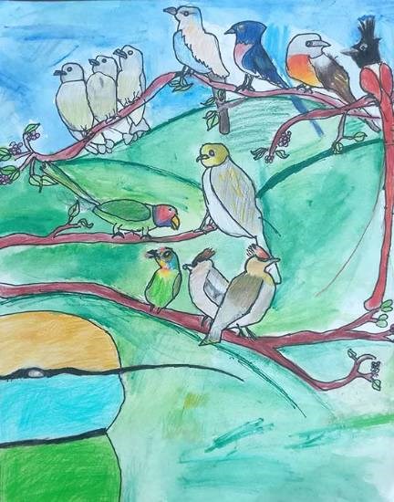 Birds Convention Shortlisted in Khula Aasmaan art competition for children Keywords: birds , migratory birds , birds live in india , meeting of birds , convention of birds View Portfolio icon Share Facebook Twitter Whats App Pinterest Description -- Art Number 23884 Artwork Title Birds Convention Artist Name Kriti Parameshvyas Medium Colour Pencil on Paper Size 11.69 x 8.27 inches (29.6926 x 21.0058 cm) Information Its about birds that migrate and live in India having a meeting. This painting by child artist Kriti Parameshvyas (9 years) received a Shortlist in Khula Aasmaan art competition for children for July 2021.