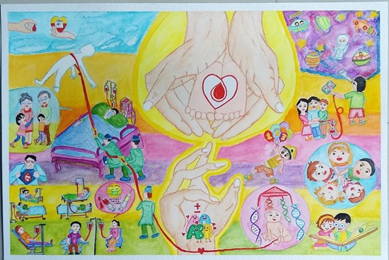 Blood donation, painting by Child Artist Aron Raj View Portfolio icon Share Facebook Twitter Whats App Pinterest Description -- Art Number 24151 Artwork Title Blood donation Artist Name Aron Raj Medium Watercolour on Paper Information In my artwork I tried to explain how our donated blood saves life and the how it make a thalassaemia children to dream as like other child.