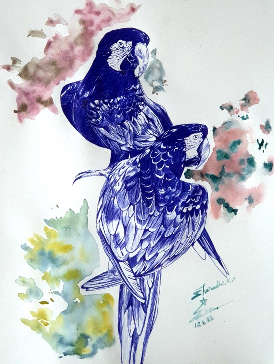 Tropical birds, painting by Child Artist Sharadhi K V View Portfolio icon Share Facebook Twitter Whats App Pinterest Description -- Art Number 24731 Artwork Title Tropical birds Artist Name Sharadhi K V Medium Watercolour & Waterproof Ink Pen on Texture Paper Information The reference is taken from a photograph.it took me 72 hours to complete.thos piece of artwork is made by using a ballpoint pen