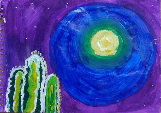 Information I love blending colors and I feel the sky is the canvas where colors blend beautifully. This is a night where the full moon shines on the desert and cactus gleams in the moonlight. The sky is deep purple and blue and pretty stars shine in it too. It is a quiet night in the desert.