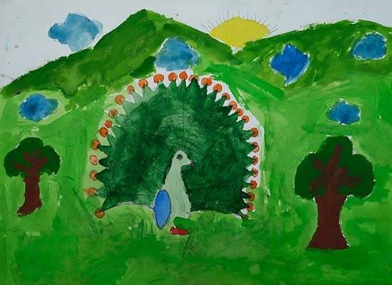 Peacock Bronze medal from Art contest no. 1 for all Ashramshalas Keywords: peacock , opened feather , sun , hills , greenery , tree , dance , bird View Portfolio icon Share Facebook Twitter Whats App Pinterest Description -- Art Number 24977 Artwork Title Peacock Artist Name Manoj Ghute Medium Watercolour on Paper Size 11.69 x 16.53 inches (29.6926 x 41.9862 cm) Information Manoj Ghute (class 6), Kohor Ashramshala, Nashik PO - Bronze medal from Art contest no. 1 for all Ashramshalas of Tribal Development Department, Govt. of Maharashtra