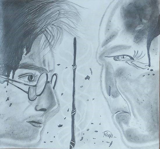 Harry Potter and Voldemort Shortlisted in Khula Aasmaan art contest Keywords: harry potter , Voldemort , figurative , my favorite characters , my favorite film View Portfolio icon Share Facebook Twitter Whats App Pinterest Description -- Art Number 25047 Artwork Title Harry Potter and Voldemort Artist Name Rupkatha guria Medium Pencil on Paper Size 11.69 x 8.27 inches (29.6926 x 21.0058 cm) Information This a sketch of Harry Potter and Voldemort This artwork by child artist Rupkatha Guria (15 years), Shortlisted in Khula Aasmaan kids drawing competition for January to March 2022