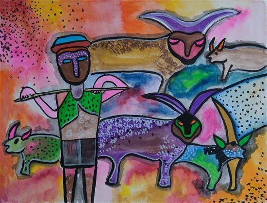Cowherd Shortlisted in Khula Aasmaan art children's painting competition Keywords: cowherd , cow , buffaloes , animal , figurative , children's painting competition , Khula Aasmaan View Portfolio icon Share Facebook Twitter Whats App Pinterest Description -- Art Number 25167 Artwork Title Cowherd Artist Name Bhayani Rutva Medium Watercolour on Paper Size 11.69 x 16.53 inches (29.6926 x 41.9862 cm) Information I love different type of paintings that s why I decided to draw this creative cowherd. He care about cows and buffaloes so we get fresh milk and he is one of our helper so I have huge respect for him so I divided to draw this creative cowherd. This painting by child artist Rutva Sunilkumar Bhayani (15 years) received a Shortlist in Khula Aasmaan children's painting competition for April to June 2022.