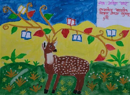 Stag Shortlisted from Art contest no. 1 for all Ashramshalas Keywords: Stag , Sambar Deer , vegetation , decorative horns , little tail , books , leaves View Portfolio icon Share Facebook Twitter Whats App Pinterest Description -- Art Number 25560 Artwork Title Stag Artist Name Savita Pawar Medium Poster colour on Paper Size 8.26 x 11.43 inches (20.9804 x 29.0322 cm) Information Savita Pawar (class 9), Sukapur Ashramshala, Dhule PO - Shortlisted from Art contest no. 1 for all Ashramshalas of Tribal Development Department, Govt. of Maharashtra