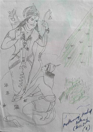 Meeting of Ram and Hanuman Shortlisted from Art contest no. 1 for all Ashramshalas Keywords: Ram and Hanuman , mountain , crown , god , faith , spiritual View Portfolio icon Share Facebook Twitter Whats App Pinterest Description -- Art Number 25648 Artwork Title Meeting of Ram and Hanuman Artist Name Pruthviraj Bethe Medium Pencil on Paper Size 11.02 x 8.26 inches (27.9908 x 20.9804 cm) Information Pruthviraj Bethe (class 10), Kutanga Ashramshala, Dharani PO - Shortlisted from Art contest no. 1 for all Ashramshalas of Tribal Development Department, Govt. of Maharashtra