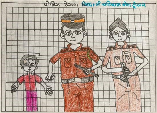 Police Station Shortlisted from Art contest no. 2 for all Ashramshalas Keywords: Police Station , dream , my future , police officers , inspector , uniform , constable jail , prisoner , criminal , figurative View Portfolio icon Share Facebook Twitter Whats App Pinterest Description -- Art Number 26320 Artwork Title Police Station Artist Name Payal Bhangare Medium Oil Pastel and Sketch pen on Paper Size 8.26 x 11.43 inches (20.9804 x 29.0322 cm) Information Payal Bhangare (class 7), Asarbari Ashramshala, Nashik PO - Shortlisted from Art contest no. 2 for all Ashramshalas of Tribal Development Department, Govt. of Maharashtra