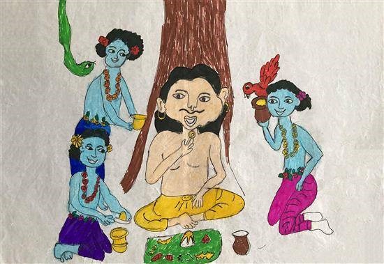 Feast Shortlisted from Art contest no. 2 for all Ashramshalas Keywords: feast , boy eating food , Coconut leaf , meal , traditional costumes , wearing garland , snake , serving View Portfolio icon Share Facebook Twitter Whats App Pinterest Description -- Art Number 26351 Artwork Title Feast Artist Name Rutika Lahate Medium Mixed Media on Paper Size 10.62 x 14.56 inches (26.9748 x 36.9824 cm) Information Rutika Lahate (class 6), Shirasgaon Ashramshala, Nashik PO - Shortlisted from Art contest no. 2 for all Ashramshalas of Tribal Development Department, Govt. of Maharashtra
