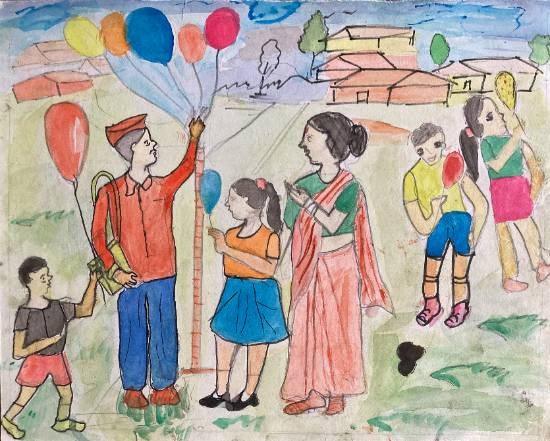 Balloon Seller Shortlisted from Art contest no. 2 for all Ashramshalas Keywords: balloon seller , stand of balloon , colorful balloons , balloons , mother , daughter , boys holding balloon , roof tile home , colorful balloon View Portfolio icon Share Facebook Twitter Whats App Pinterest Description -- Art Number 26372 Artwork Title Balloon Seller Artist Name Sapana Gavande Medium Mixed Media on Paper Information Sapana Gavande (class 9), Mhasgan Ashramshala, Nashik PO - Shortlisted from Art contest no. 2 for all Ashramshalas of Tribal Development Department, Govt. of Maharashtra