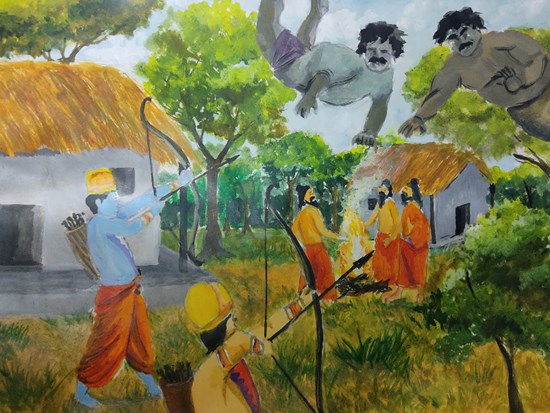 Scene from the Ramayana, painting by Child Artist Souhardya Talukdar View Portfolio icon Share Facebook Twitter Whats App Pinterest Description -- Art Number 26514 Artwork Title Scene from the Ramayana Artist Name Souhardya Talukdar Medium Watercolour & Acrylic on Paper Size 11 x 13 inches (27.94 x 33.02 cm) Information When the rakshashas disturbed the rishis Rama and Laksmana saved them by fighting the rakshashas( demons)
