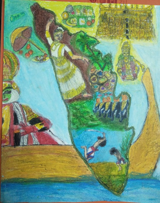 Kerala in one picture, painting by Child Artist Vijayashree Kakubal View Portfolio icon Share Facebook Twitter Whats App Pinterest Description -- Art Number 26525 Artwork Title Kerala in one picture Artist Name Vijayashree Kakubal Medium Watercolour and pastel on Sheet Information Art done by oil pastels and colour pencils
