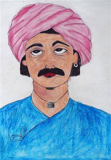 Portrait painting Shortlisted from Art contest no. 3 for all Ashramshalas Keywords: portrait painting , turban , rural man , mustacho , short hair , earring , locket View Portfolio icon Share Facebook Twitter Whats App Pinterest Description -- Art Number 26745 Artwork Title Portrait painting Artist Name Karina Babar Medium Oil Pastel on Paper Size 10.62 x 14.56 inches (26.9748 x 36.9824 cm) Information Karina Babar (class 8), Dabhadi Ashramshala, Dahanu PO - Shortlisted from Art contest no. 3 for all Ashramshalas of Tribal Development Department, Govt. of Maharashtra