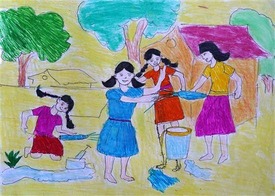 Girl playing Holi Shortlisted from Art contest no. 3 for all Ashramshalas Keywords: girl playing holi , festival of colors , Basantotsav , ancient Hindu tradition , roof tile home , trees , color gun , bucketful colored water , festival of Spring , festival of love View Portfolio icon Share Facebook Twitter Whats App Pinterest Description -- Art Number 26761 Artwork Title Girl playing Holi Artist Name Ujwala Mali Medium Mixed Media on Paper Size 10.62 x 14.56 inches (26.9748 x 36.9824 cm) Information Ujwala Mali (class 7), Kandarwadi Ashramshala, Dahanu PO - Shortlisted from Art contest no. 3 for all Ashramshalas of Tribal Development Department, Govt. of Maharashtra