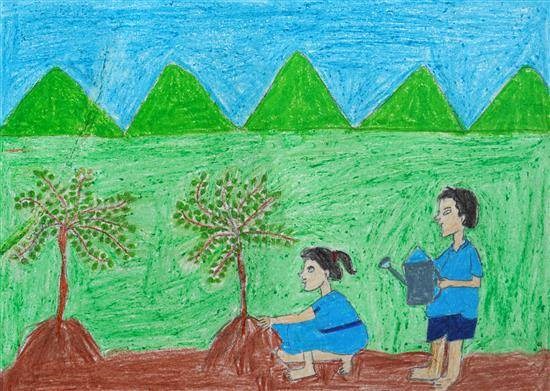 Children planting trees Shortlisted from Art contest no. 3 for all Ashramshalas Keywords: children planting trees , mountain , greenery , boy , holding watering pot View Portfolio icon Share Facebook Twitter Whats App Pinterest Description -- Art Number 26764 Artwork Title Children planting trees Artist Name Pratiksha Guhe Medium Oil Pastel on Paper Size 10.62 x 14.56 inches (26.9748 x 36.9824 cm) Information Pratiksha Guhe (class 6), Nanivali Ashramshala, Dahanu PO - Shortlisted from Art contest no. 3 for all Ashramshalas of Tribal Development Department, Govt. of Maharashtra
