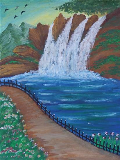 Waterfall's landscape Shortlisted from Art contest no. 3 for all Ashramshalas Keywords: waterfall's landscape , bridge , grass , waterfall , mountain , birds in sky , waterflow , red flowers View Portfolio icon Share Facebook Twitter Whats App Pinterest Description -- Art Number 26828 Artwork Title Waterfall's landscape Artist Name Anjana Khadam Medium Poster colour on Paper Size 14.56 x 10.62 inches (36.9824 x 26.9748 cm) Information Anjana Khadam (class 9), Boripada Ashramshala, Nashik PO - Shortlisted from Art contest no. 3 for all Ashramshalas of Tribal Development Department, Govt. of Maharashtra