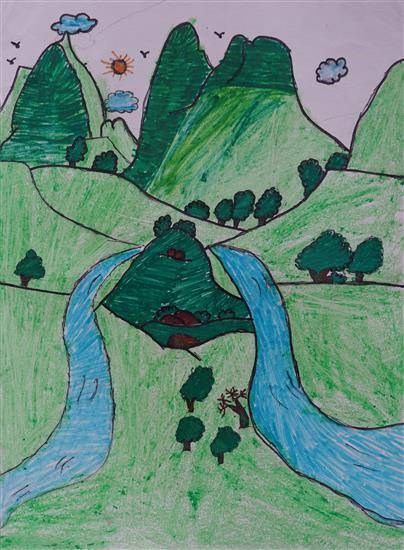 River flow through mountain Shortlisted from Art contest no. 3 for all Ashramshalas Keywords: river flow , mountain , greenery , Sun , birds in sky , cloud , rocks , leafless tree View Portfolio icon Share Facebook Twitter Whats App Pinterest Description -- Art Number 26844 Artwork Title River flow through mountain Artist Name Pavan Palave Medium Oil Pastel and Sketch pen on Paper Size 14.56 x 10.62 inches (36.9824 x 26.9748 cm) Information Pavan Palave (class 5), Pimpalgaon Ashramshala, Nashik PO - Shortlisted from Art contest no. 3 for all Ashramshalas of Tribal Development Department, Govt. of Maharashtra