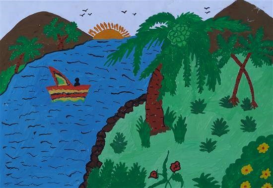Voyage through river Shortlisted from Art contest no. 3 for all Ashramshalas Keywords: voyage through river , Sun , birds in sky , coconut tree , greenery , red yellow flowers , grass , waterflow , morning , mountain View Portfolio icon Share Facebook Twitter Whats App Pinterest Description -- Art Number 26875 Artwork Title Voyage through river Artist Name Radha Kallo Medium Poster colour on Paper Size 8.26 x 11.81 inches (20.9804 x 29.9974 cm) Information Radha Kallo (class 10), Borgaon Bazar Ashramshala, Deori PO - Shortlisted from Art contest no. 3 for all Ashramshalas of Tribal Development Department, Govt. of Maharashtra