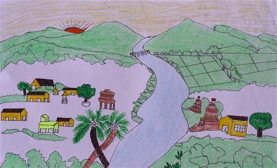 River scenery Shortlisted from Art contest no. 3 for all Ashramshalas Keywords: river scenery , bush , grass , mountain , red Sun , temple , coconut tree , orange sky , briedge , water flow View Portfolio icon Share Facebook Twitter Whats App Pinterest Description -- Art Number 27017 Artwork Title River scenery Artist Name Tanushree Chaudhari Medium Oil pastel and pen on Paper Size 8.46 x 10.03 inches (21.4884 x 25.4762 cm) Information Tanushree Chaudhari (class 9), Ganore Ashramshala, Kalwan PO - Shortlisted from Art contest no. 3 for all Ashramshalas of Tribal Development Department, Govt. of Maharashtra