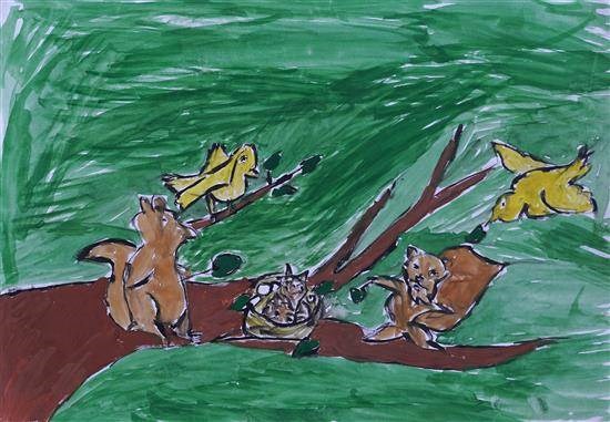 Squirrels and Birds Shortlisted from Art contest no. 3 for all Ashramshalas Keywords: squirrels and birds , bushy tails , yellow birds , eggs in nest , tree branch View Portfolio icon Share Facebook Twitter Whats App Pinterest Description -- Art Number 27033 Artwork Title Squirrels and Birds Artist Name Rohan Sawalkar Medium Poster colour on Paper Size 8.26 x 11.81 inches (20.9804 x 29.9974 cm) Information Rohan Sawalkar (class 6), Panaj Ashramshala, Akola PO - Shortlisted from Art contest no. 3 for all Ashramshalas of Tribal Development Department, Govt. of Maharashtra