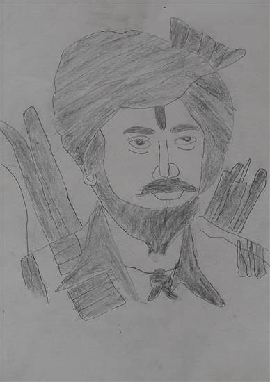 Freedom fighter Khajya Naik Shortlisted from Art contest no. 3 for all Ashramshalas Keywords: freedom fighter , Khajya Naik , a revolutionary , tika on forehead , gun , bullets band , turban , a forgotten fighter , tribal revolutionary View Portfolio icon Share Facebook Twitter Whats App Pinterest Description -- Art Number 27045 Artwork Title Freedom fighter Khajya Naik Artist Name Sonali Chondkar Medium Pencil on Paper Size 11.81 x 8.26 inches (29.9974 x 20.9804 cm) Information Sonali Chondkar (class 7), Kothali Ashramshala, Akola PO - Shortlisted from Art contest no. 3 for all Ashramshalas of Tribal Development Department, Govt. of Maharashtra