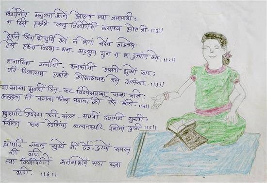 Praise of education Shortlisted from Art contest no. 4 for all Ashramshalas Keywords: praise of education , importance of education , ribbon , traditional costume , reading book , valuable ornament , good friend , a consultant View Portfolio icon Share Facebook Twitter Whats App Pinterest Description -- Art Number 27160 Artwork Title Praise of education Artist Name Eknath Barge Medium Oil pastel and pen on Paper Size 8.26 x 11.81 inches (20.9804 x 29.9974 cm) Information Eknath Barge (class 8), Pimpaldari Ashramshala, Kalamnuri PO - Shortlisted from Art contest no. 4 for all Ashramshalas of Tribal Development Department, Govt. of Maharashtra