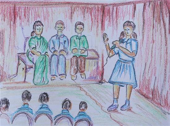 Speech competition in School Shortlisted from Art contest no. 4 for all Ashramshalas Keywords: speech competition , girl holding mike , stage , audience , examiner , bench , saree , hair bun , chair View Portfolio icon Share Facebook Twitter Whats App Pinterest Description -- Art Number 27209 Artwork Title Speech competition in School Artist Name Mayuri Kinnake Medium Crayons on Paper Size 10.62 x 14.96 inches (26.9748 x 37.9984 cm) Information Mayuri Kinnake (class 9), Chandan kheda Ashramshala, Chimur PO - Shortlisted from Art contest no. 4 for all Ashramshalas of Tribal Development Department, Govt. of Maharashtra