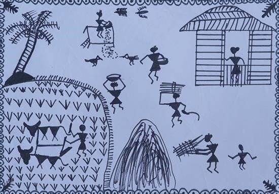 Lifestyle Shortlisted from Art contest no. 4 for all Ashramshalas Keywords: lifestyle , grass , coconut tree , grass bunch , home , women standing in gallery , worker in farm , plowing , bulls View Portfolio icon Share Facebook Twitter Whats App Pinterest Description -- Art Number 27314 Artwork Title Lifestyle Artist Name Sagar Vadde Medium Sketch Pen on Paper Size 8.26 x 11.81 inches (20.9804 x 29.9974 cm) Information Sagar Vadde (class 4), Kothi Ashramshala, Bhamragad PO - Shortlisted from Art contest no. 4 for all Ashramshalas of Tribal Development Department, Govt. of Maharashtra