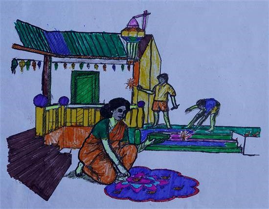 Diwali festival Shortlisted from Art contest no. 4 for all Ashramshalas Keywords: diwali festival , festival of Lights , boys holding fire cracker , rangoli , mother holding rangoli bowl , lamp , roof tile home , stairs , lantern , Hindu festival View Portfolio icon Share Facebook Twitter Whats App Pinterest Description -- Art Number 27395 Artwork Title Diwali festival Artist Name Nandini Malache Medium Sketch Pen on Paper Size 8.46 x 11.46 inches (21.4884 x 29.1084 cm) Information Nandini Malache (class 7), Sukapur Ashramshala, Dhule PO - Shortlisted from Art contest no. 4 for all Ashramshalas of Tribal Development Department, Govt. of Maharashtra