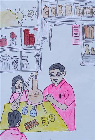 Education about Science experiment Shortlisted from Art contest no. 4 for all Ashramshalas Keywords: education , Science experiment , teacher , students , self , materials , flasks , test tube rack , burner View Portfolio icon Share Facebook Twitter Whats App Pinterest Description -- Art Number 27460 Artwork Title Education about Science experiment Artist Name Priyanjali Mundhe Medium Pen and Watercolour on Paper Size 12.2 x 8.26 inches (30.988 x 20.9804 cm) Information Priyanjali Mundhe (class 6), Kohane Ashramshala, Rajur PO - Shortlisted from Art contest no. 4 for all Ashramshalas of Tribal Development Department, Govt. of Maharashtra