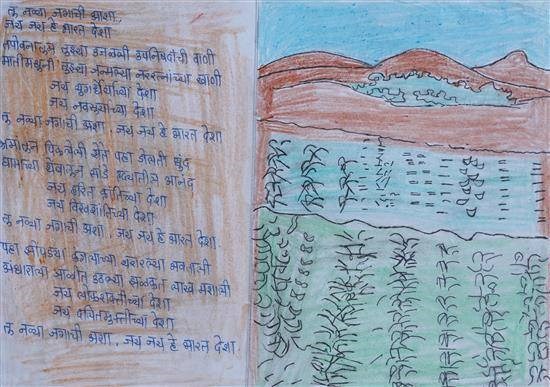 Jay jay he Bharat desha Shortlisted from Art contest no. 4 for all Ashramshalas Keywords: Jay jay he Bharat desha , mountains , grass , crops , farm , business in village View Portfolio icon Share Facebook Twitter Whats App Pinterest Description -- Art Number 27474 Artwork Title Jay jay he Bharat desha Artist Name Aditi Shirsath Medium Oil pastel and pen on Paper Size 8.26 x 11.61 inches (20.9804 x 29.4894 cm) Information Aditi Shirsath (class 9), Keli Kotul Ashramshala, Rajur PO - Shortlisted from Art contest no. 4 for all Ashramshalas of Tribal Development Department, Govt. of Maharashtra
