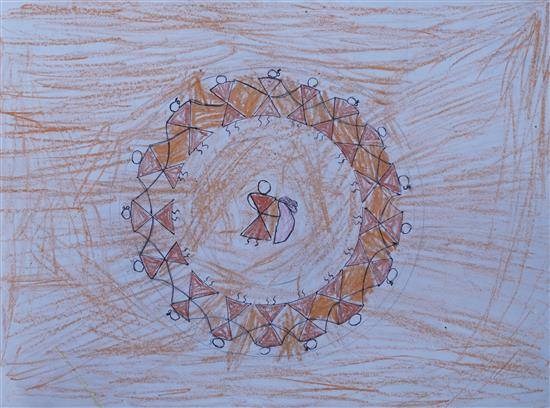 Adivasi group dance Shortlisted from Art contest no. 4 for all Ashramshalas Keywords: adivasi group dance , tribal culture , tradition , holded hands , dwelling , lifestyle View Portfolio icon Share Facebook Twitter Whats App Pinterest Description -- Art Number 27504 Artwork Title Adivasi group dance Artist Name Arati Sapate Medium Oil Pastel on Paper Size 14.76 x 10.82 inches (37.4904 x 27.4828 cm) Information Arati Sapate (class 6), Kharpadi Ashramshala, Nashik PO - Shortlisted from Art contest no. 4 for all Ashramshalas of Tribal Development Department, Govt. of Maharashtra