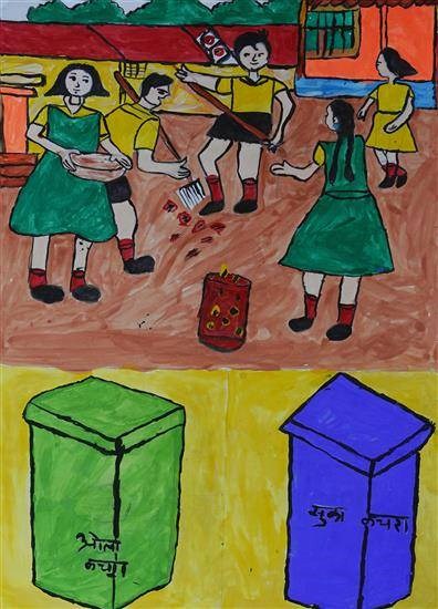 Keep your school clean Shortlisted from Art contest no. 4 for all Ashramshalas Keywords: keep your school clean , students , roof tile buildings , girl holding basket , boy holding broom , green dress , yellow shirt , dust bin View Portfolio icon Share Facebook Twitter Whats App Pinterest Description -- Art Number 27520 Artwork Title Keep your school clean Artist Name Sunita Dhongade Medium Poster colour on Paper Size 14.76 x 10.82 inches (37.4904 x 27.4828 cm) Information Sunita Dhongade (class 8), Bopegaon Ashramshala, Nashik PO - Shortlisted from Art contest no. 4 for all Ashramshalas of Tribal Development Department, Govt. of Maharashtra