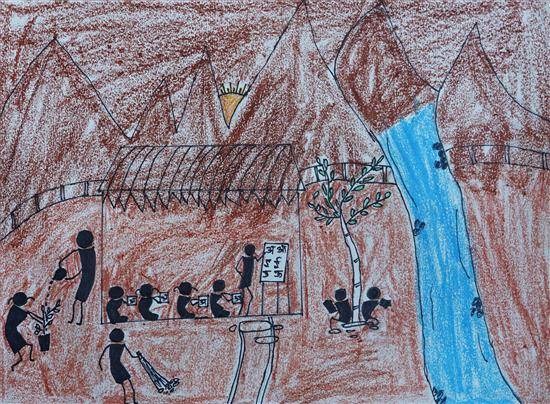 Tribal children Shortlisted from Art contest no. 4 for all Ashramshalas Keywords: tribal children , water flow , mountain , Sun , students , children reading book , watering plant , cleaning , foot path View Portfolio icon Share Facebook Twitter Whats App Pinterest Description -- Art Number 27530 Artwork Title Tribal children Artist Name Mayur Gurav Medium Oil Pastel and Sketch pen on Paper Size 10.82 x 14.76 inches (27.4828 x 37.4904 cm) Information Mayur Gurav (class 6), Thanapada Ashramshala, Nashik PO - Shortlisted from Art contest no. 4 for all Ashramshalas of Tribal Development Department, Govt. of Maharashtra