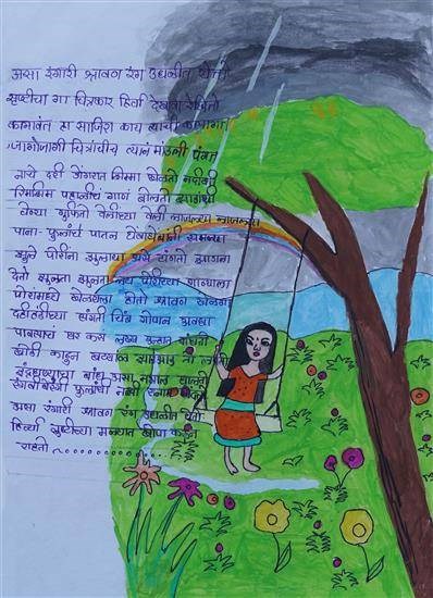 Asa Rangari Shravan Gold medal from Art contest no. 4 for all Ashramshalas Keywords: asa Rangari Shravan , a Marathi month , dark sky , raining , swing , colorful flowers , grass , water flow , happy girl , designed dress View Portfolio icon Share Facebook Twitter Whats App Pinterest Description -- Art Number 27630 Artwork Title Asa Rangari Shravan Artist Name Vidya Gavade Medium Pen and Watercolour on Paper Size 11.61 x 8.26 inches (29.4894 x 20.9804 cm) Information Vidya Gavade (class 8), Chikhalgaon Ashramshala, Ghodegaon PO - Gold medal from Art contest no. 4 for all Ashramshalas of Tribal Development Department, Govt. of Maharashtra
