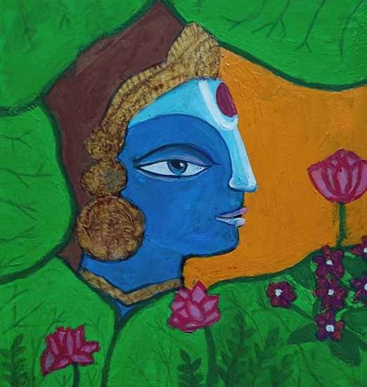 Shree Krishna painting by Kaavya Shah Keywords: Shree Krishna , god , Lord Krishna View Portfolio icon Share Facebook Twitter Whats App Pinterest Description -- Art Number 28327 Artwork Title Shree Krishna Artist Name Kaavya Shah Medium Acrylic & watercolour on Paper Information This painting depicts Shree Krishna's face surrounded by lotus flowers. His serene expression exudes tranquillity, while the lotus symbolizes purity and enlightenment in Hinduism. The vibrant colours and intricate details capture the divine essence of Krishna, evoking a sense of peace and devotion in the viewer's heart.