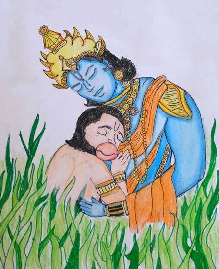 Milap of Lord Hanuman & Shri Rama Shortlisted in Khula Aasmaan Ramayana art contest Keywords: Ramayana , Hanuman , Ram , Shree Ram , Lord Hanuman , mythology , god , milap View Portfolio icon Share Facebook Twitter Whats App Pinterest Description -- Art Number 28331 Artwork Title Milap of Lord Hanuman & Shri Rama Artist Name Anshul Shinde Medium Oil Pastel on Paper Size 13.5 x 11 inches (34.29 x 27.94 cm) Price Rs. 5,000 ($67.84) Information "The Incident was depicted when Lord Hanuman meets Lord Rama for the very first time and the lines form Hanuman chalisa Sahas badan tumharo jas gave || aasa kahi shrepati kanth lagave||" This painting by child artist Anshul Shinde (8 years), Shortlisted in Khula Aasmaan Ramayana art contest.