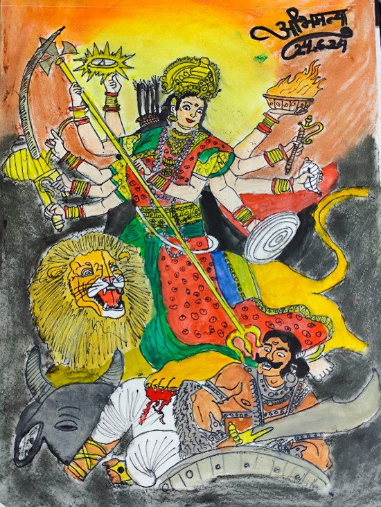 Mahisasurmardini, painting by Child Artist Abhimaneyu Singh View Portfolio icon Share Facebook Twitter Whats App Pinterest Description -- Art Number 28428 Artwork Title Mahisasurmardini Artist Name Abhimaneyu Singh Medium Watercolor Pencils on Sheet Information Mahishasura was the son of the asura Rambha and a she-buffalo named Mahisi. He was ultimately killed by the goddess Durga with her trishula (trident) after which she gained the epithet Mahishasuramardini ("Slayer of Mahishasura.