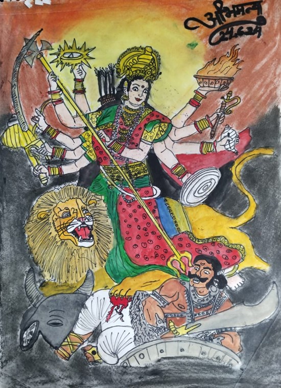 Mahishasuramardini, painting by Child Artist Abhimaneyu Singh View Portfolio icon Share Facebook Twitter Whats App Pinterest Description -- Art Number 28449 Artwork Title Mahishasuramardini Artist Name Abhimaneyu Singh Medium Watercolour and pastel on Sheet Information Mahishasuramardini is a Hindu stotra, or prayer, that praises the goddess Durga and her act of slaying the asura Mahishasura.