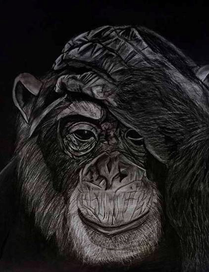 Chimpanzee painting by Pratham Chauhan Keywords: chimpanzee , animal , wild animal View Portfolio icon Share Facebook Twitter Whats App Pinterest Description -- Art Number 28514 Artwork Title Chimpanzee Artist Name Pratham Chauhan Medium Charcoal on Paper Size 27.5 x 21.6 inches (69.85 x 54.864 cm) Information A striking charcoal artwork of a chimpanzee, showcasing deep, expressive eyes and textured fur. Bold strokes and rich shading create depth, highlighting its intelligence and emotion in a raw, monochromatic style.