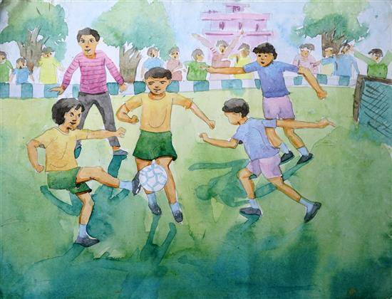 View Details Girl's playing Foot ball Color pencils and Sketch pens on Paper 8.46 x 11.61 inches 21.49 x 29.49 cm