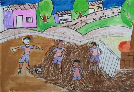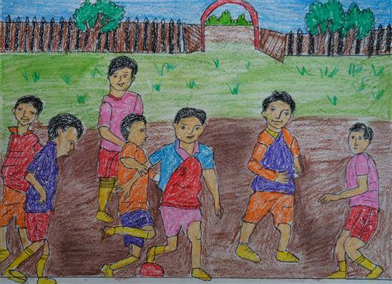 View Details Friends playing at ground Oil Pastel and Sketch pen on Paper 10.62 x 14.56 inches 26.97 x 36.98 cm