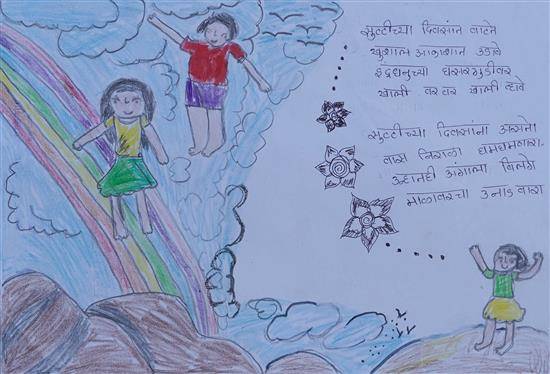 View Details Children enjoying vacation Oil Pastel and Sketch pen on Paper 10.62 x 14.56 inches 26.97 x 36.98 cm