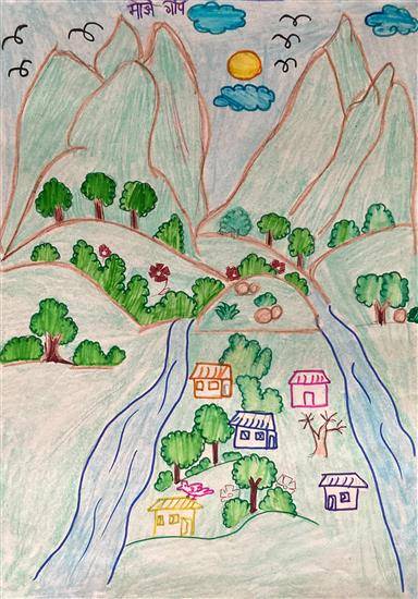 View Details Small village Color pencils, crayons and sketch pens on Paper 14.58 x 10.64 inches 37.03 x 27.03 cm