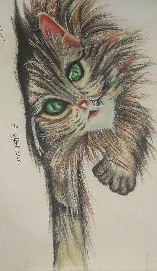 Lying cat with green eyes, painting by Young Artist Daljeet Kaur