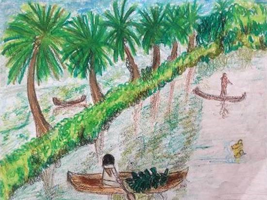 Beauty of Kerala, painting by Child Artist Pradnya Pratapsinh Sarnikar Children’s art in Khula Aasmaan, a platform for creative expression by children & young adults Keywords: Beauty of Kerala , kerala , nature , boat , coconut trees , banana trees View Portfolio icon Share Facebook Twitter Whats App Pinterest Description -- Art Number 21191 Artwork Title Beauty of Kerala Artist Name Pradnya Pratapsinh Sarnikar Medium Pastel on Paper Size 8.27 x 11.69 inches (21.0058 x 29.6926 cm) Information Coconut and banana are special products of Kerala. The man taking coconut from the tree and banana is transported through the boat.