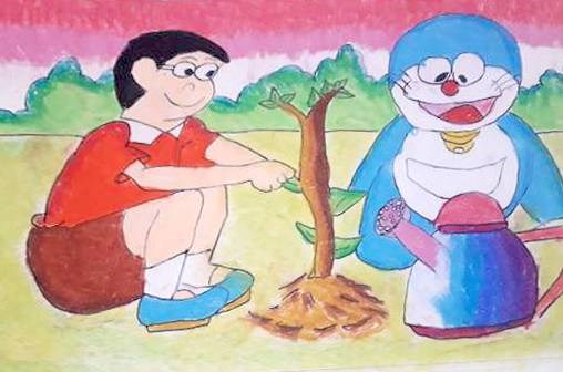 Tree planting by nobita, painting by Child Artist Antara Shivram Desai