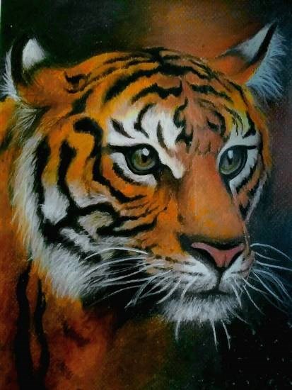 Royal Bengal Tiger Painting by Aritra Dey Keywords: tiger , bengal tiger , wild , animal , wild animal , wildlife , national animal View Portfolio icon Share Facebook Twitter Whats App Pinterest Description -- Art Number 22949 Artwork Title Royal Bengal Tiger Artist Name Aritra Dey Medium Soft pastels on Paper Size 11.69 x 8.27 inches (29.6926 x 21.0058 cm) Information In this artwork i wanted to emphasis the vibrant and the preying eyes of royal Bengal tigers which are on the verge of extinction.