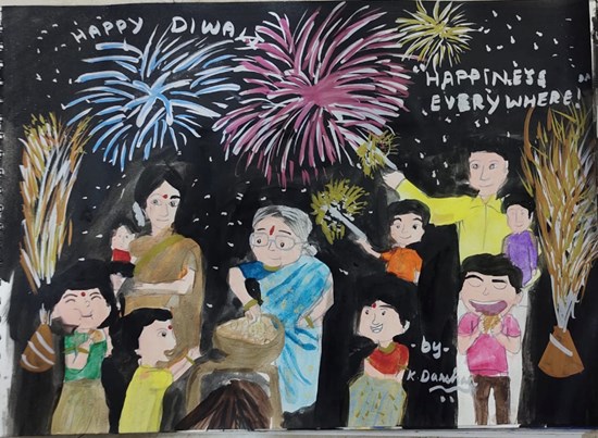 Diwali : Happiness everywhere Keywords: Diwali , Deepavali , happiness , festival of light , festival , happy family , celebration View Portfolio icon Share Facebook Twitter Whats App Pinterest Description -- Art Number 26075 Artwork Title Diwali : Happiness everywhere Artist Name Darshan K. Medium Acrylic on Paper Information Diwali, or Deepavali, also known as the Festival of Lights. In northern India, they celebrate the story of King Rama's return to Ayodhya after he defeated Ravana by lighting rows of clay lamps. Southern India celebrates it as the day that Lord Krishna defeated the demon Narakasura. I drew this work of a Happy Family Celebrating the Festival of Diwali happily and joyously with its members. I made this artwork using Acrylic Colours and A3 Drawing Sheet.