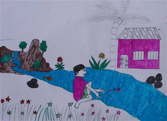 Boy playing with fish Shortlisted from Art contest no. 3 for all Ashramshalas Keywords: boy playing with fish , roof tile home , coconut tree , mountain , red flower , rocks , fishes in water View Portfolio icon Share Facebook Twitter Whats App Pinterest Description -- Art Number 26959 Artwork Title Boy playing with fish Artist Name Shivani Anil Kale Medium Sketch Pen & Pencil on Paper Size 11.02 x 13.97 inches (27.9908 x 35.4838 cm) Information Shivani Kale (class 6), Amravati Ashramshala, Dharani PO - Shortlisted from Art contest no. 3 for all Ashramshalas of Tribal Development Department, Govt. of Maharashtra