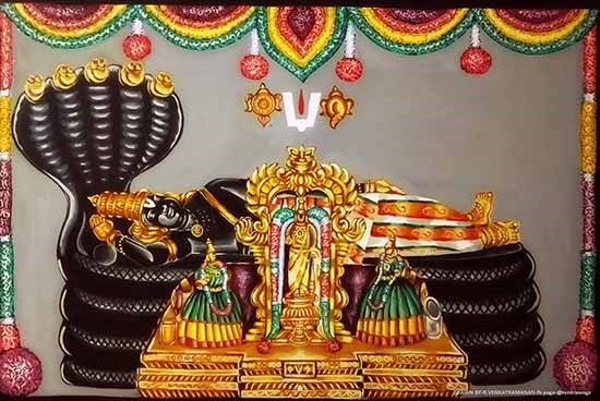 Ranganathar painting by Venkatramanan R Keywords: Lord Vishnu , Srirangam temple , god , Ranganathar View Portfolio icon Share Facebook Twitter Whats App Pinterest Description -- Art Number 27717 Artwork Title Ranganathar Artist Name Venkatramanan R Medium Oil Paint on Canvas board Size 23.6 x 35.4 inches (59.944 x 89.916 cm) Information This is an Oil Painting of Lord Vishnu in Srirangam temple