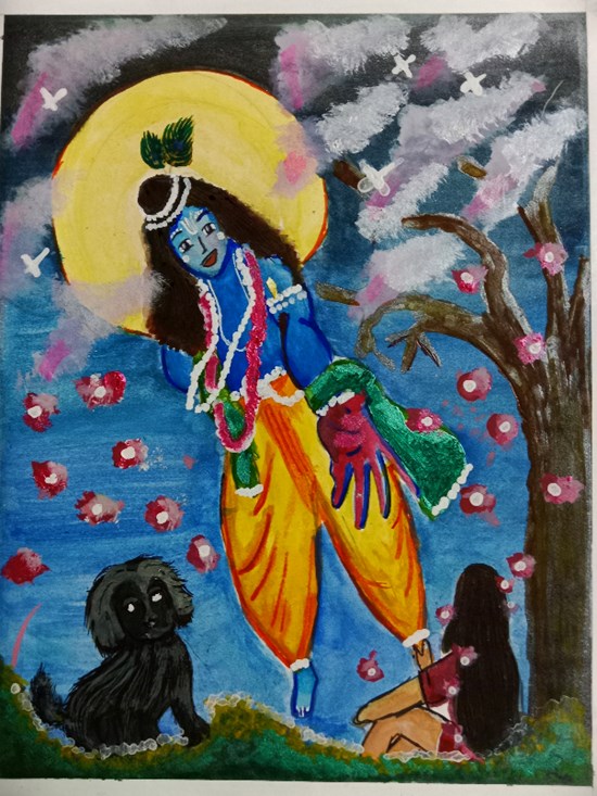 Krishna fate, painting by Child Artist Kangna Garg View Portfolio icon Share Facebook Twitter Whats App Pinterest Description -- Art Number 27802 Artwork Title Krishna fate Artist Name Kangna Garg Medium Watercolour & Acrylic on Wood Information I have used water color . In this painting i show that there always kahana ji and your pet who make my mood good , today painting all about what I think 🤔🤔🤔